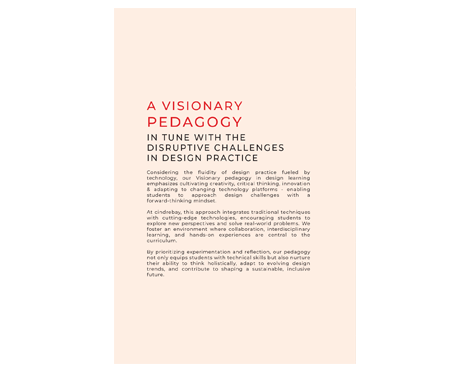 Cindrebay design school cultivates a comprehensive,multidisciplinary approach to design learning that focuses on experimentation and innovative thinking. We aim to create a design culture and pedagogy that is contemporary, engaging, accessible, affordable and ethical, also cherishing designers who strive to create a resilient and safe world.